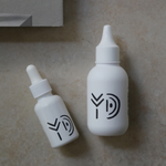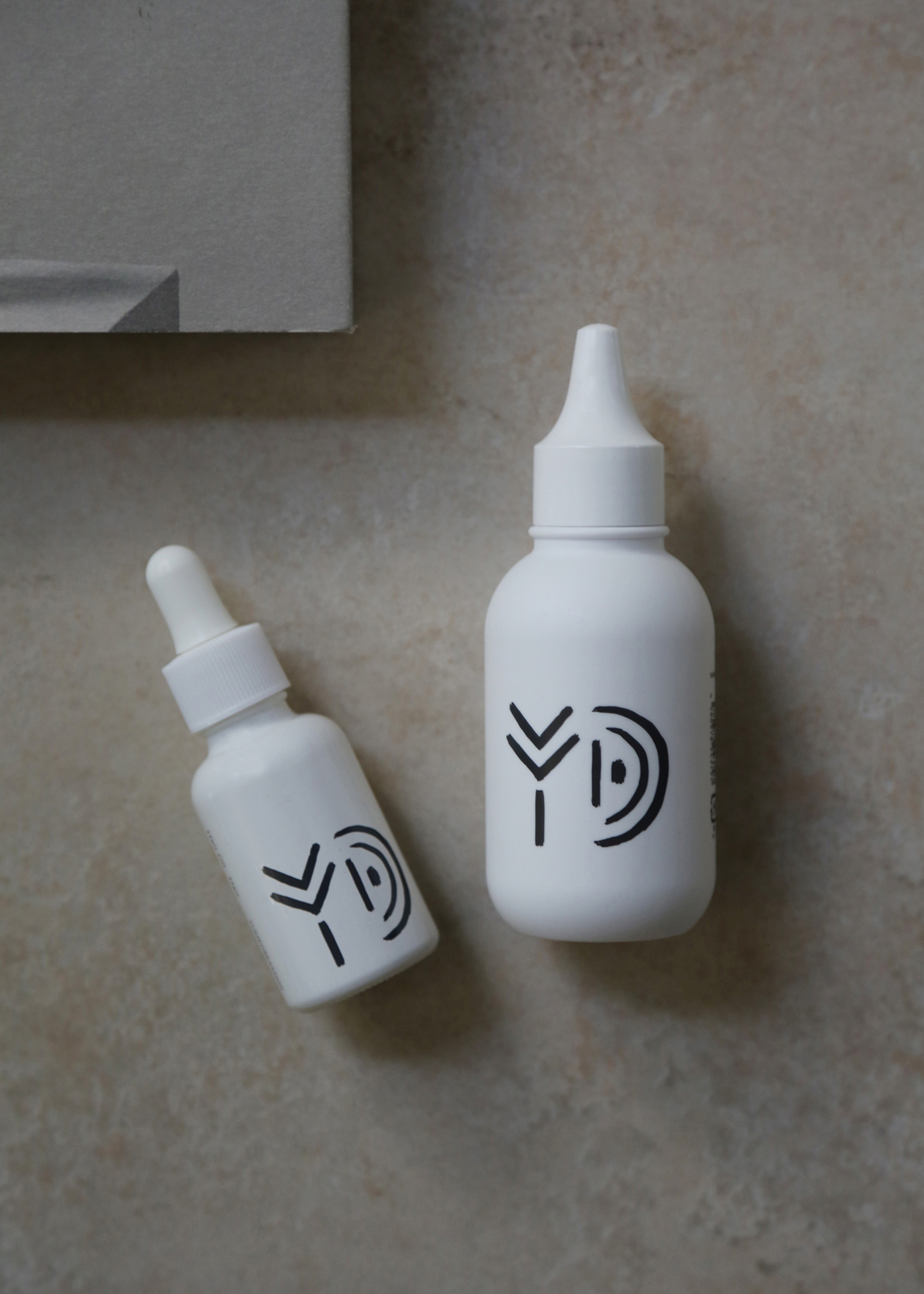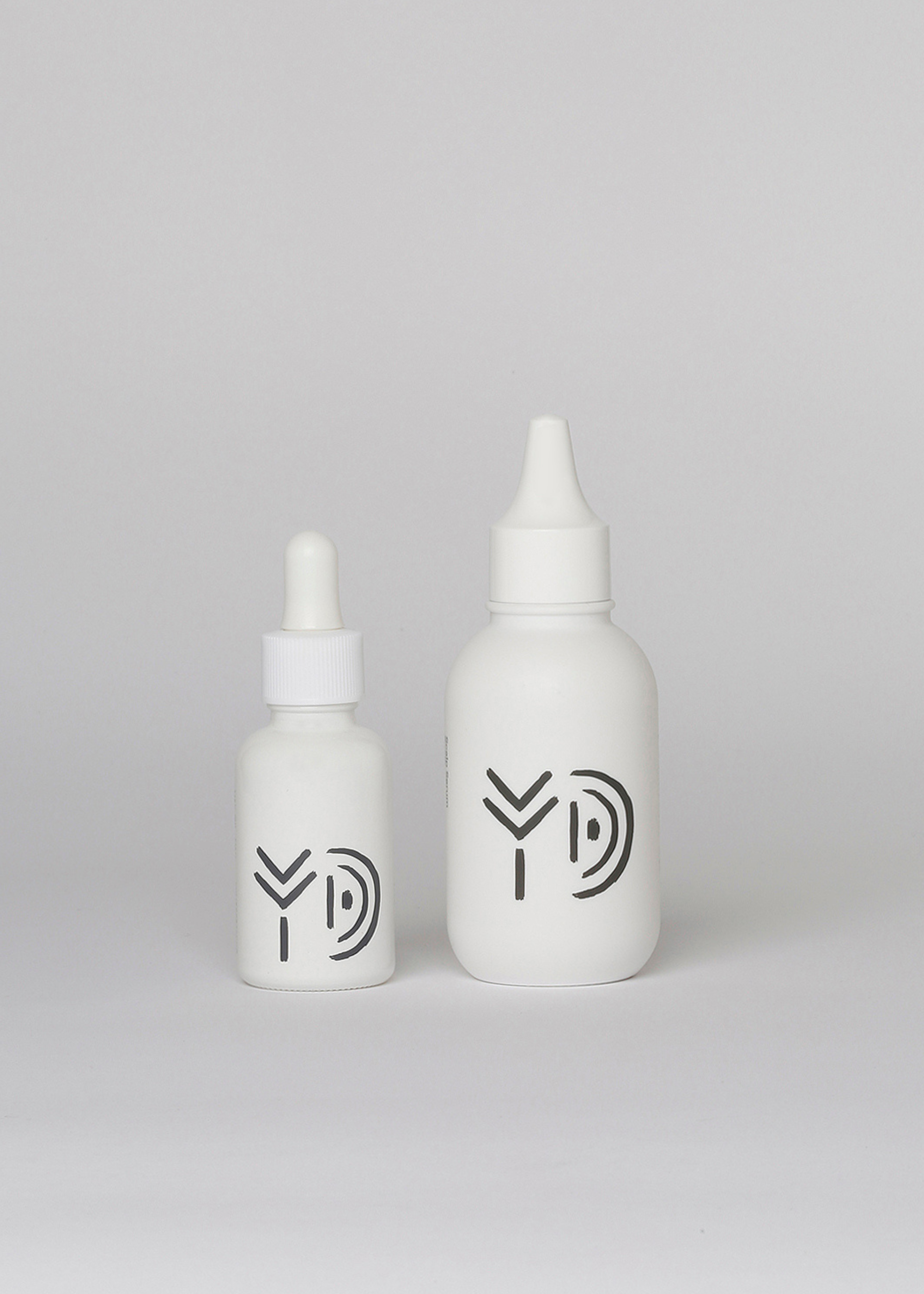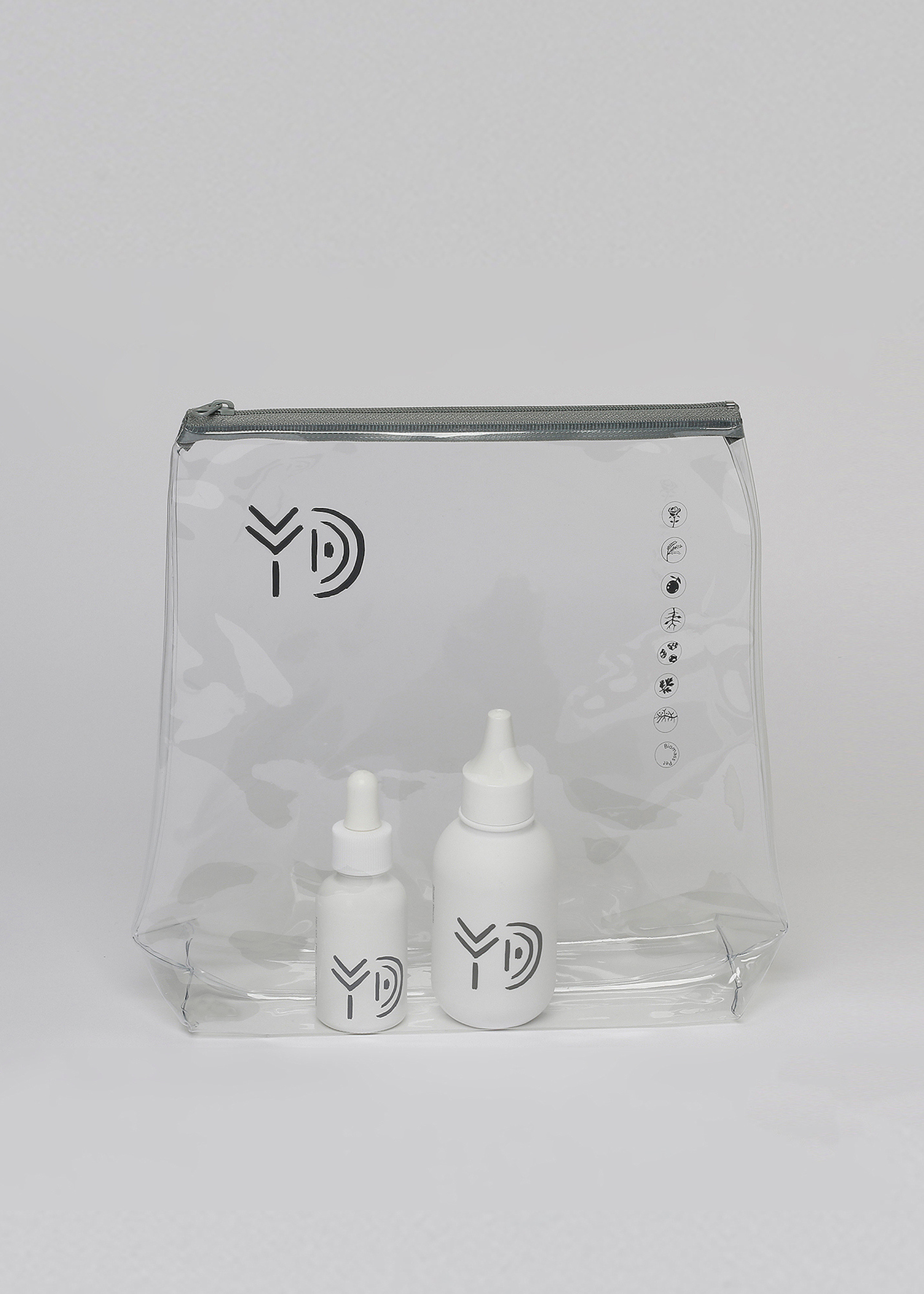 PVC再生素材(端材やロス素材となるPVCを含有)を採用したパッケージには、大地を思わせる柔らかなフォルム、象形文字のような有機的で創造的なラインが印象的な〈YD〉のロゴと、こだわりの自然由来の植物・ミネラル成分や精油の香り、素材をまとめたオリジナルのアイコンマークがほどこされています。