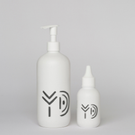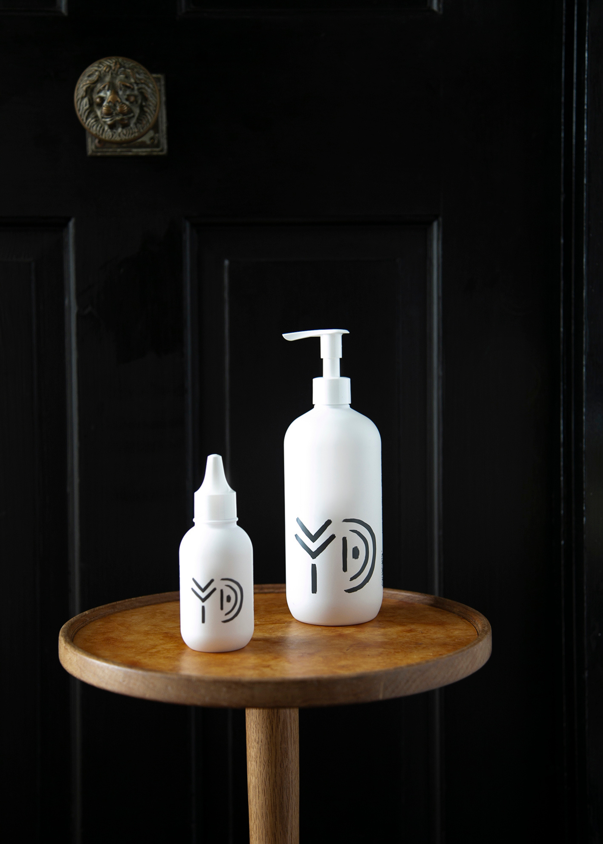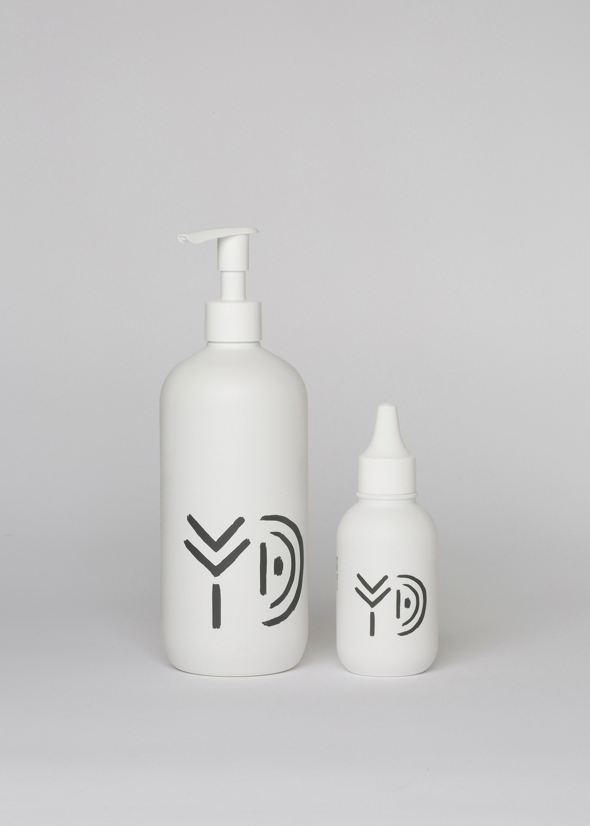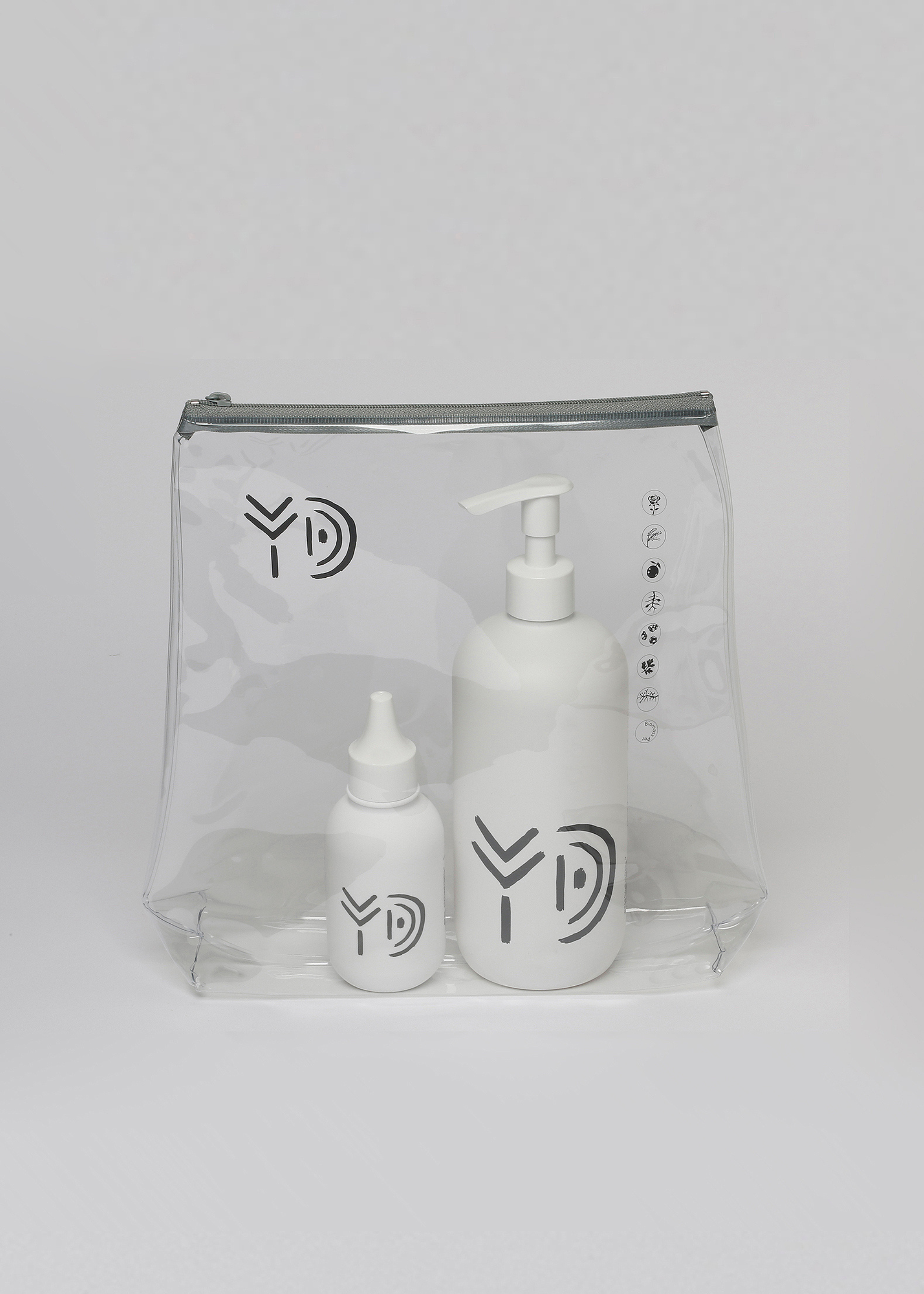 PVC再生素材(端材やロス素材となるPVCを含有)を採用したパッケージには、大地を思わせる柔らかなフォルム、象形文字のような有機的で創造的なラインが印象的な〈YD〉のロゴと、こだわりの自然由来の植物・ミネラル成分や精油の香り、素材をまとめたオリジナルのアイコンマークがほどこされています。